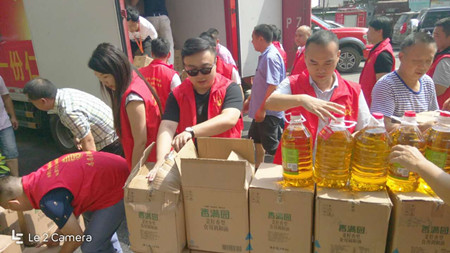 公司副總經(jīng)理、常務(wù)副會(huì)長周卜榮在酷暑中,頂著35度高溫,汗流浹背卸載賑災(zāi)物資。