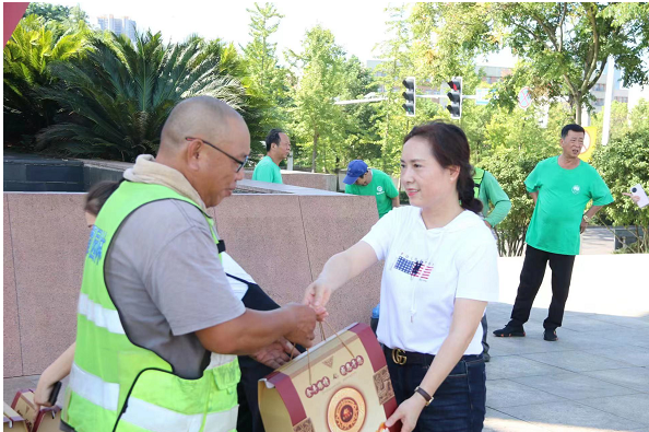 在現(xiàn)場,卜健萍董事長一行對園林工作人員不畏炎熱、堅守崗位表示誠摯的慰問和感謝,并將清涼大禮包送到在場的每一位綠化工人手里,讓他們感受到湘潭這座城市的溫情與美好。